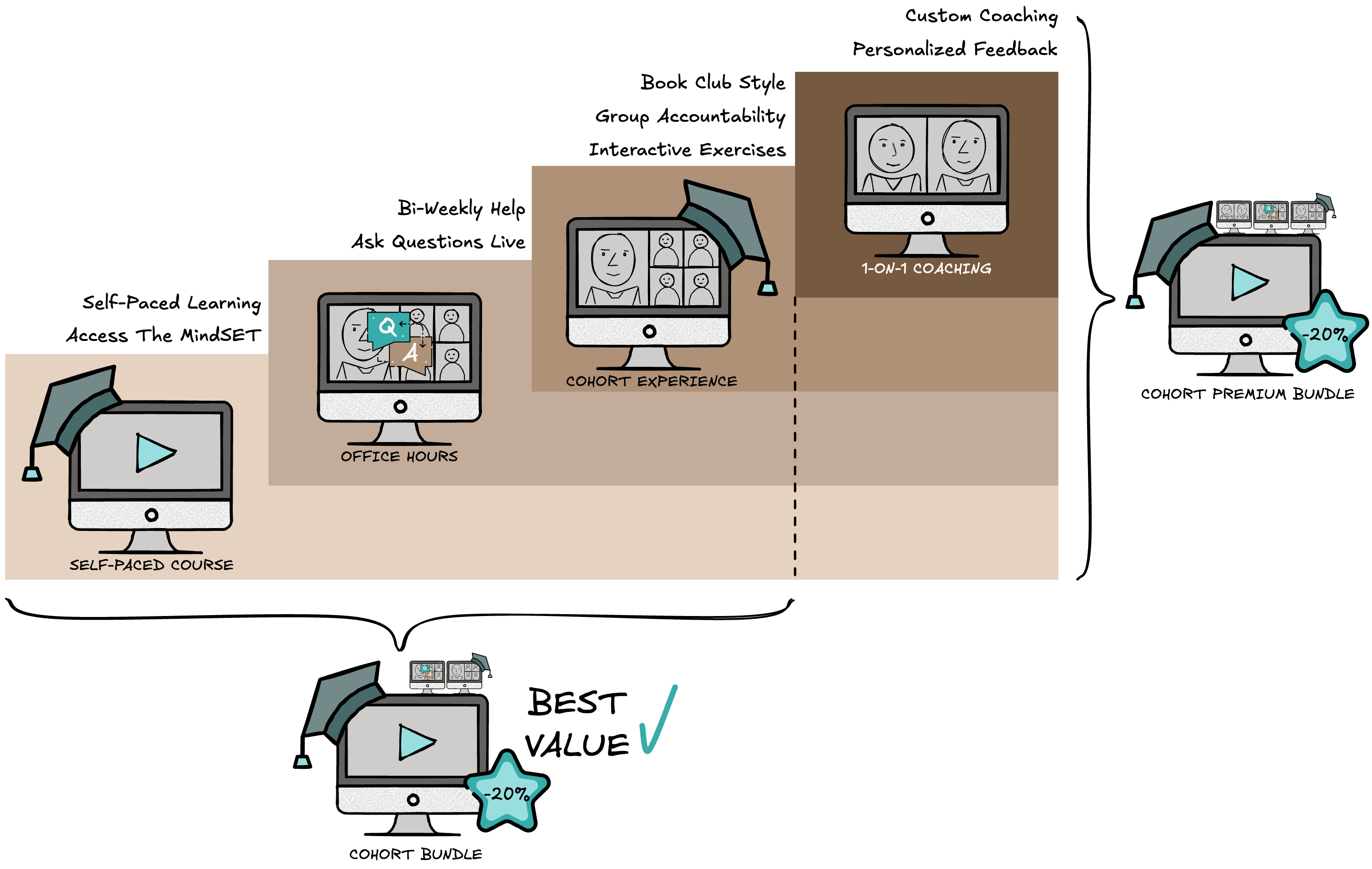 The Base Bundle combines the Self-Paced Course, Office Hours, and the Cohort Experience. This bundle offers everything you need to succeed: a flexible course, real-time support, and a collaborative learning environment. If you're new to The MindSET, I recommend this path for a solid foundation and lasting success.